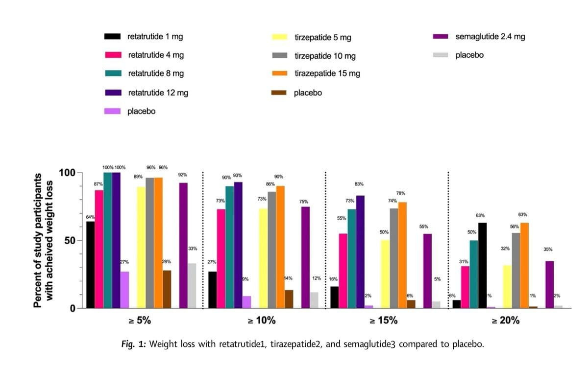 Jastreboff AM, et al. "Weight loss with retatrutide, tirzepatide, and semaglutide compared to placebo."